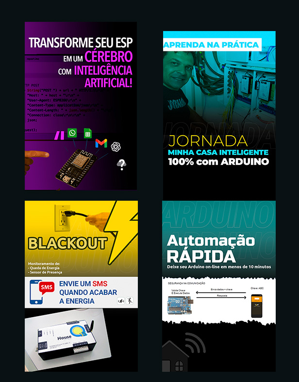 - Transforme seu ESP em um CÉREBRO : É o projeto onde você aprende a conectar o ESP com ferramentas como Make, Google Sheets, WhatsApp, Gmail e até Inteligência Artificial, criando automações poderosas e inteligentes na prática.